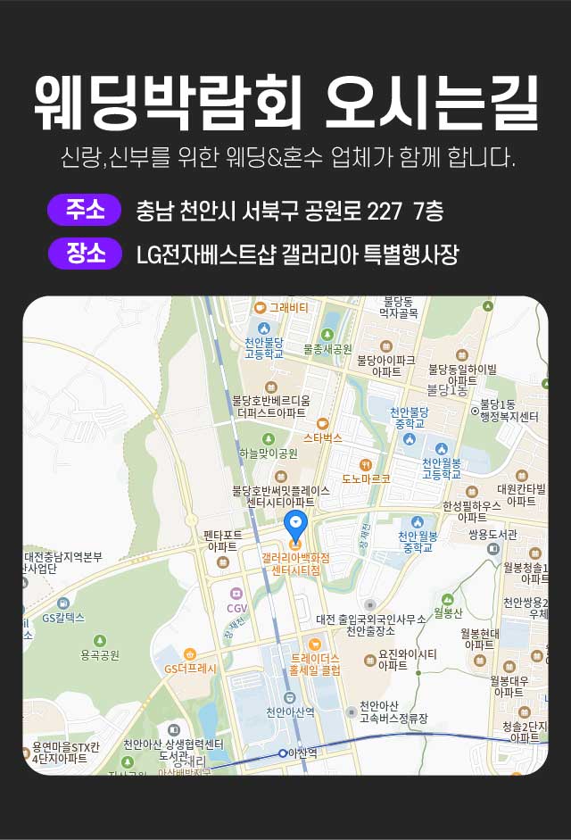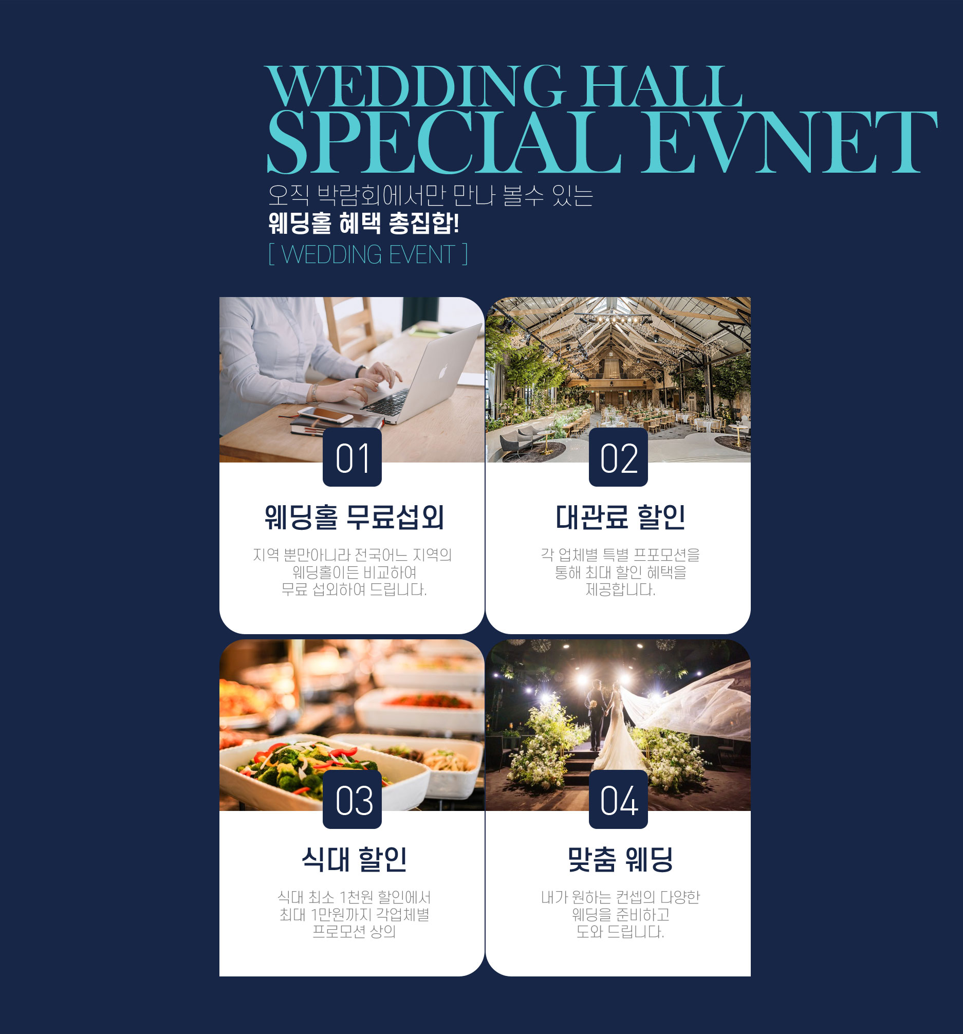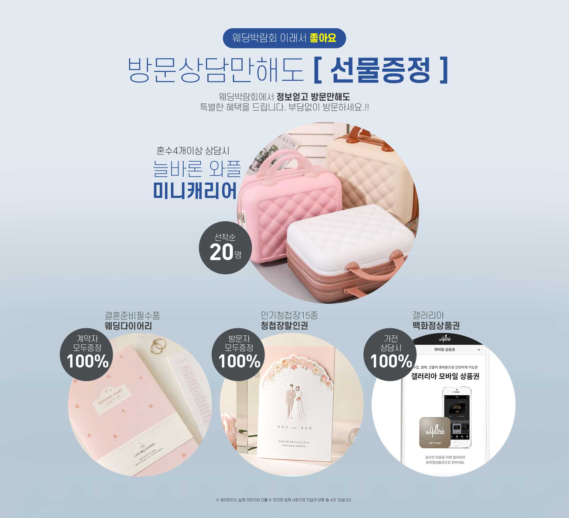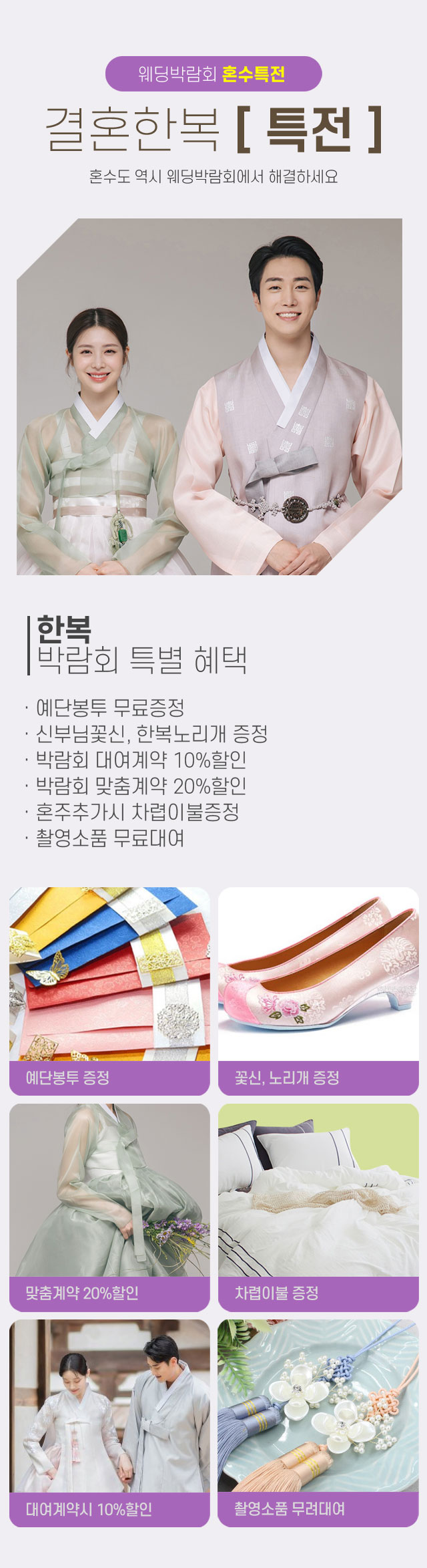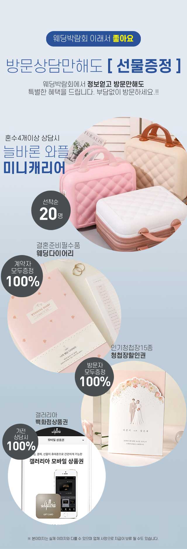개인정보의 수집 및 이용목적 약관동의 내용 ▶ 개인정보의 수집 및 이용목적 - 서비스 이용에 따른 본인식별, 실명확인, 가입의사 확인, 연령제한 서비스 이용 - 고지사항 전달, 불만처리 의사소통 경로 확보, 물품배송 시 정확한 배송지 정보 확보 - 신규 서비스 등 최신정보 안내 및 개인맞춤서비스 제공을 위한 자료 - 기타 원활한 양질의 서비스 제공 등 ▶웨딩박람회 수집하는 개인정보의 항목 - 이름, 이메일, 주민등록번호, 주소, 연락처, 핸드폰번호, 그 외 선택항목 [개인정보의 수집 및 이용목적 약관동의] ▶ 개인정보의 수집 및 이용목적 - 서비스 이용에 따른 본인식별, 실명확인, 가입의사 확인, 연령제한 서비스 이용 - 고지사항 전달, 불만처리 의사소통 경로 확보, 물품배송 시 정확한 배송지 정보 확보 - 신규 서비스 등 최신정보 안내 및 개인맞춤서비스 제공을 위한 자료 - 기타 원활한 양질의 서비스 제공 등 ▶ 수집하는 개인정보의 항목 - 이름, 성별, 연락처, 참가예정일 등 ▶ 개인정보의 보유 및 이용기간 - 원칙적으로 개인정보의 수집 또는 제공받은 목적 달성 시 지체 없이 파기합니다. - 다만, 원활한 서비스의 상담을 위해 상담 완료 후 내용을 3개월간 보유할 수 있으며 전자상거래에서의 소비자보호에 관한 법률 등 타법률에 의해 보존할 필요가 있는 경우에는 일정기간 보존합니다. [개인정보 제3자 제공 동의] 행사주관사 는 개인정보보호법에 의거 귀하의 개인정보를 아래와 같이 제3자 제공하는 것에 대해 동의를 받고자 합니다. 1. 개인정보를 제공받는 자 : 삼성전자판매 주식회사 2. 제공하는 개인정보 항목 : 이름, 휴대폰 번호, 예식일, 입주일 3. 이용목적 : 혼수 가전 제품 관련 판촉행사 안내 등 (TM/MMS) 4. 보유 및 이용 기간 : 제공일로부터 10개월 ※ 귀하께서는 귀하의 개인정보를 제3자에게 제공하는 것에 대한 동의를 거부하실 수 있으나, 동의를 거부하실 경우 판촉행사 안내를 받으실 수 없습니다. 광고메시지수신동의(선택) 삼성전자판매 주식회사, (주)한샘 에서 보내는 이벤트, 프로모션 등에 대한 다양한 소식을 휴대전화 문자메시지 등으로 받아보실 수 있습니다. 귀하는 언제든지 본 동의를 철회할 수 있습니다.